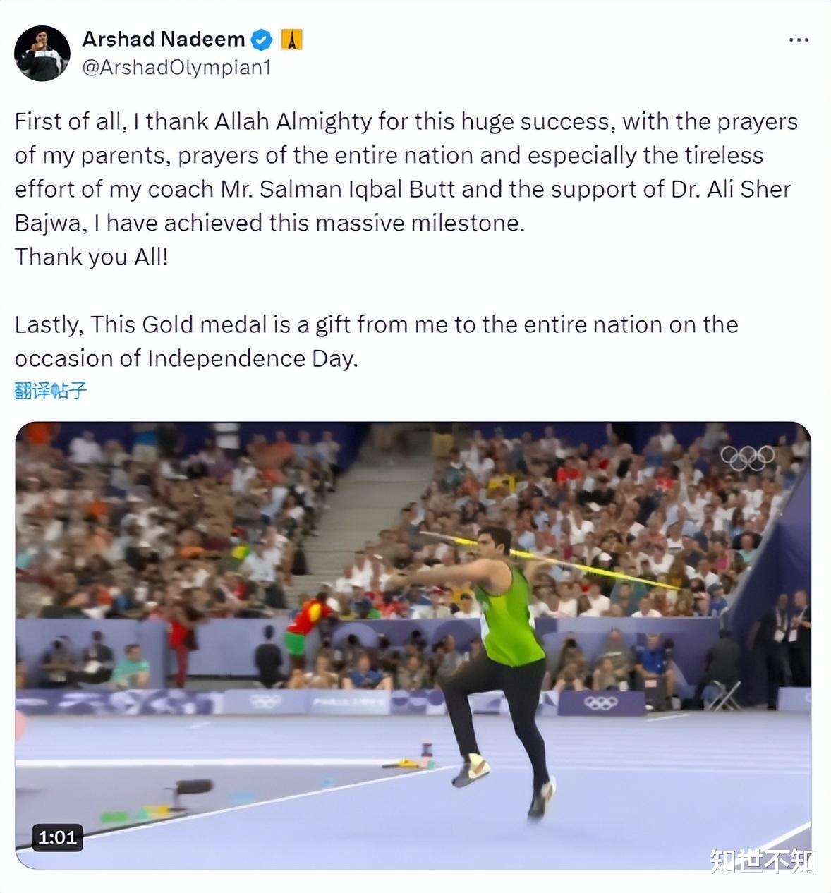 赛后巴基斯坦选手纳迪姆还在社交平台发文,“感谢神、感谢父母、感谢教练、感谢国家,终于获得了这个成就”,然后对印度致命一击来了,“这枚金牌是我给整个国家在独立日的一个礼物”。