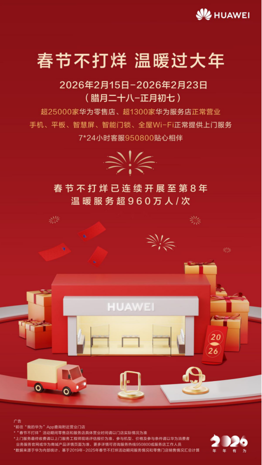 今年春节期间(2026年2月15日—23日,腊月二十八至正月初七),是华为春节不打烊活动连续开展的第8年。全国超25000家华为零售店及1300余家华为服务店将正常营业,持续提供维修、安装、热线等多元化服务,用专业与温度守护每一份团圆。