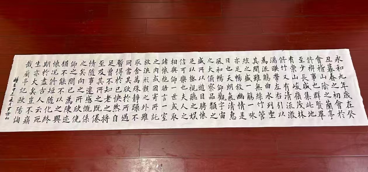 这份军旅生涯,不仅塑造了他挺拔的身姿,更将军人的风骨深深烙印在他的笔墨之中。他的书法,起笔如破阵,收笔如收兵,每一笔都力透纸背,每一幅都意蕴深远。写《卜算子·咏梅》,行楷间是梅花“零落成泥碾作尘,只有香如故”的坚韧;书《兰亭集序》,行云流水中是魏晋名士的飘逸;绘《红梅报春》,铁骨丹心里是“俏也不争春”的高洁。他的笔墨,是军人的刚毅与文人的雅致在纸墨间的完美融合,刚劲中透着温润,洒脱里藏着严谨。