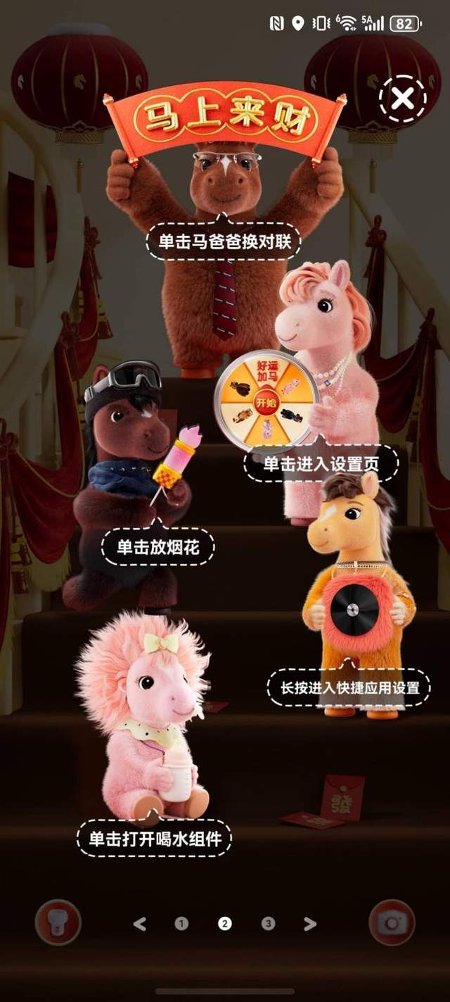 而且,这套主题不仅好看,还能在锁屏上和马家族成员们互动。通过简单的点击或长按,能挖掘出不少藏在画里的彩蛋,比如单击马爸爸可以随心切换春联文案,长按马小靓能直接呼出快捷应用面板,甚至点击马跳跳还能帮你记录每天喝了多少杯水等等。这种把实用功能藏进角色互动里的设计,让锁屏不再只是个静态壁纸,更像是一个住在手机里的福气乐园。
