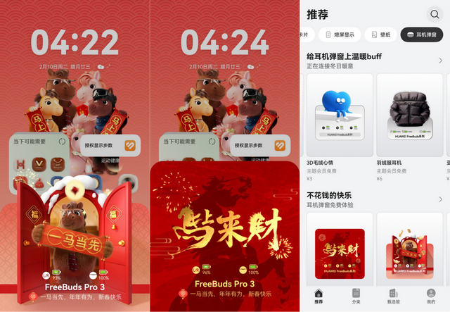 而且除了主题、表盘和百变卡片之外,今年还上新了特别喜庆的耳机弹窗《马上来财》,自从换上这个耳机弹窗之后,每次链接上蓝牙耳机的时候都好像在祝福我可以“马上来财”,《马年全家福 贺岁》主题还有自己专属的耳机弹窗,每次连上之后马爸爸都会“开门送祝福”给这个马上到来的新春增添了一份温暖的祝福。进入华为主题APP>耳机弹窗>搜索“马”>点击应用,就可以在手机上体验这个独特的耳机弹窗啦。