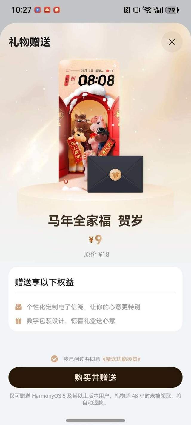 而且,主题不仅能分享,还能直接赠送。在主题详情页点右上角的礼物图标,选择购买并赠送,然后和好友的手机碰一碰,这份新年礼物就秒到账了。比起发个红包,这种面对面交换电子皮肤的操作,简直是新年社交的破冰神器。