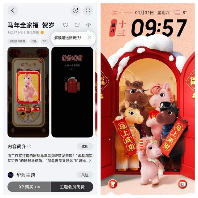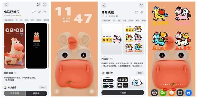 除了《马年全家福 贺岁》主题,在华为主题里搜索“马年”还有更多主题可以选择。比如这个《小马已就位》主题也非常有趣,画风走的是奇奇怪怪又可爱的路线,甚至还有隐藏款形象等你去解锁,再加上《马年祝福》的百变卡片,往桌面一摆,那种马上暴富、马上成功的寓意,真的精准戳中了我们打工人的心。