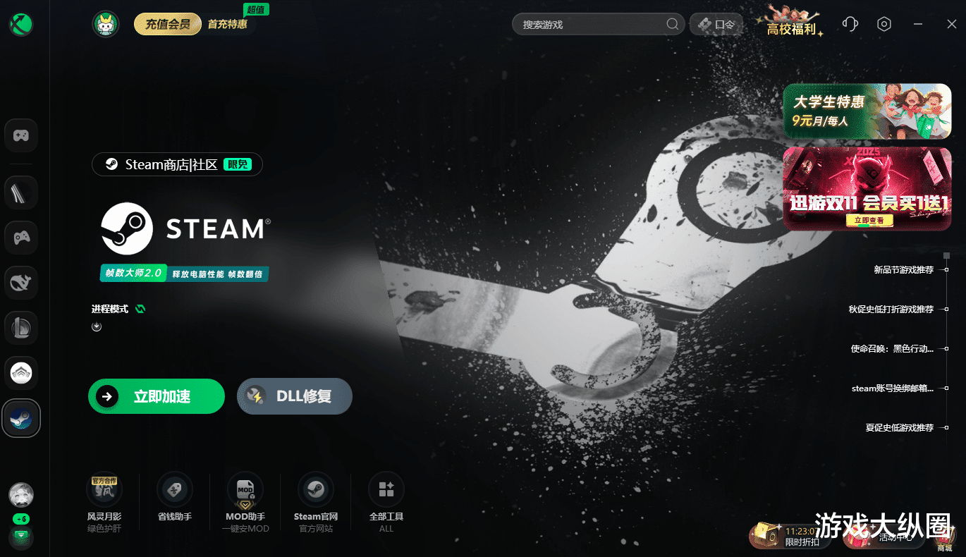 另外有玩家反馈购买游戏后游戏没入库的情况,这个则是由于steam网络延迟导致的,玩家可以使用迅游加速器针对steam的免费加速功能,先启动steam平台加速,然后再重启客户端,这时候再打开游戏库就可以找到游戏了。