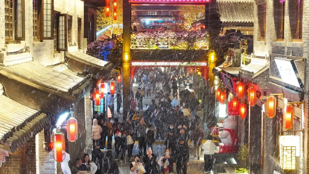 11月12日晚,游客在“雪”中游览邯郸道历史文化街区。河北日报记者 赵永辉摄