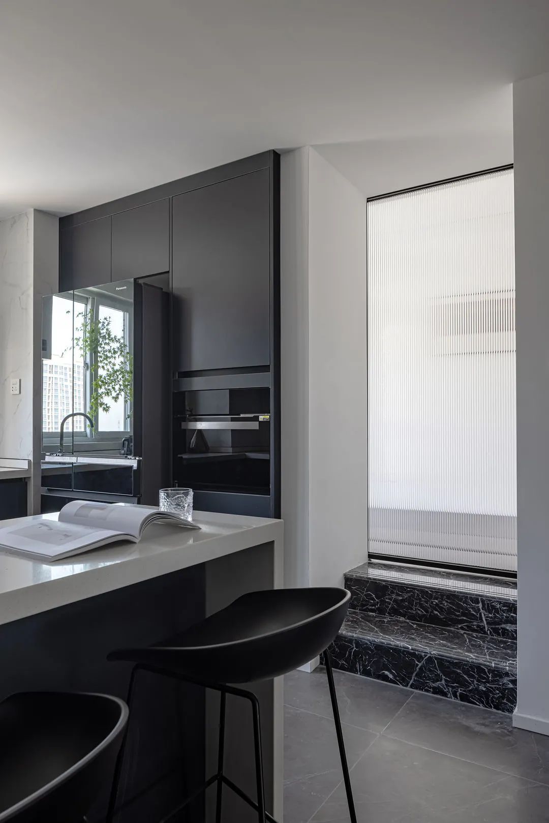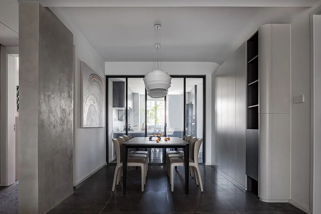 餐厨之间用玻璃材质做隔断,折叠样式可 “隐藏” 在视野里,让空间通透感直接延伸,不显割裂。