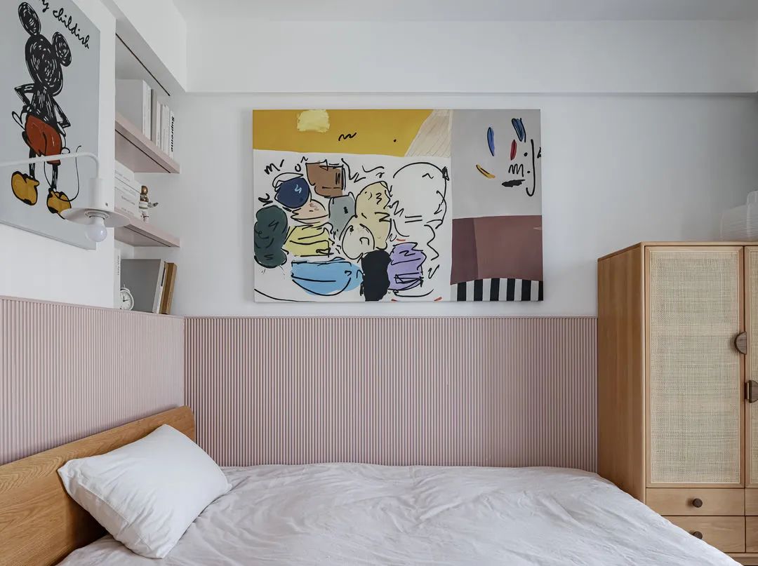 床头背景墙用 “墙漆 + 木饰面” 拼接,一分为二的设计拉伸出空间层次感,避免纯色墙面的呆板。