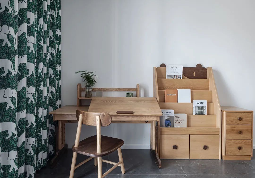 学习与玩耍区全套采用实木家具(书桌、椅子、书架、储物柜),安全性高;精致小巧的造型,孩子使用起来更顺手。