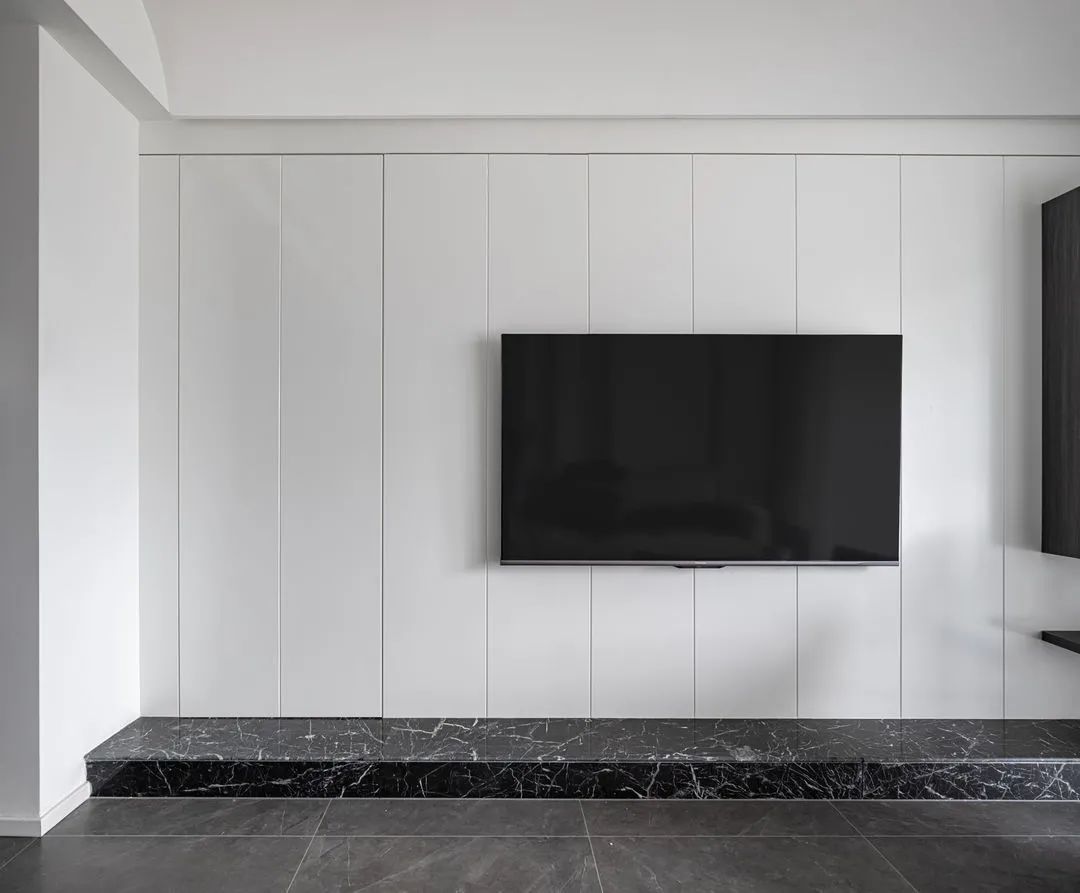 对比与隐藏:电视背景墙以光滑洁净的材质呈现,与粗粝的沙发墙形成强烈对比,让空间更显大气;设计师反复推敲背景墙比例,自然留缝,让卧室隐形门完美融入,毫不突兀;