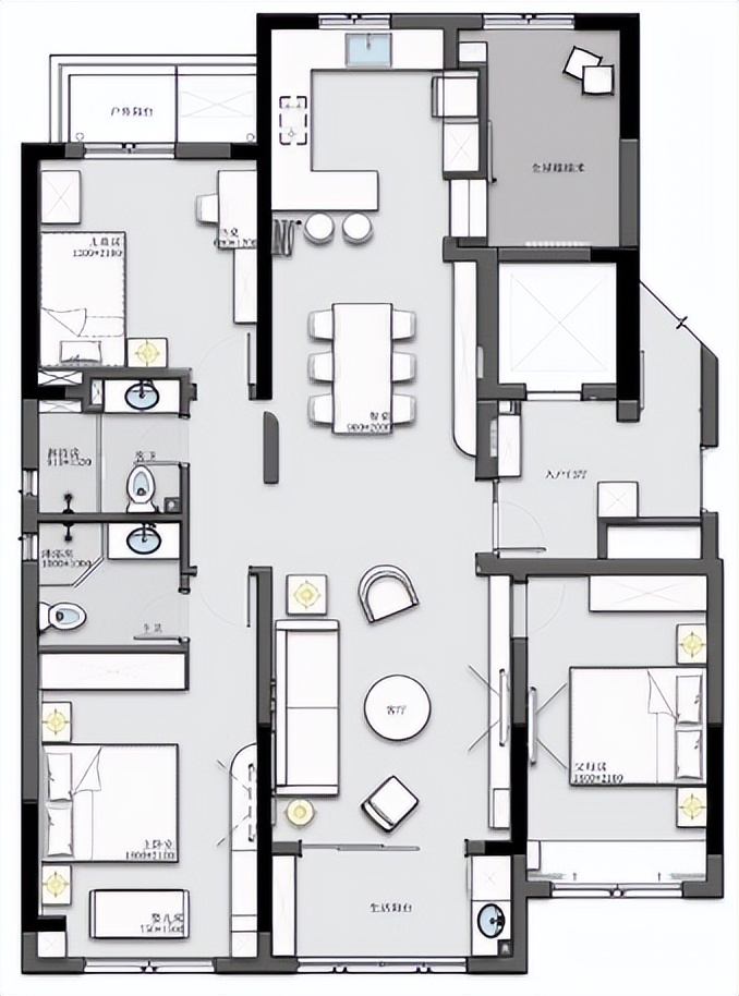 双卫面积有限 + 居住人数多:优化卫生间布局,确保功能齐全,同时增加隔断设计;