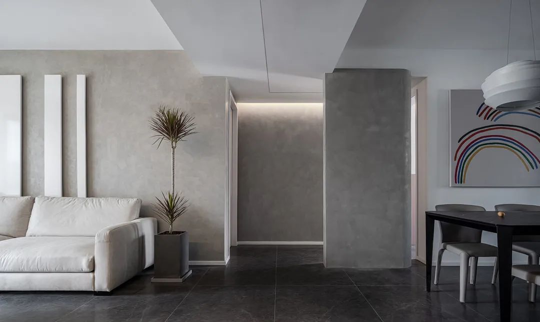 墙面与氛围:沙发墙用水泥漆,以清水质感和斑驳肌理包裹出沉着静谧的氛围,柔和的视觉感受能让人快速平复情绪;墙面肌理随光线变化呈现不同质感,成为空间的 “自然装饰”;