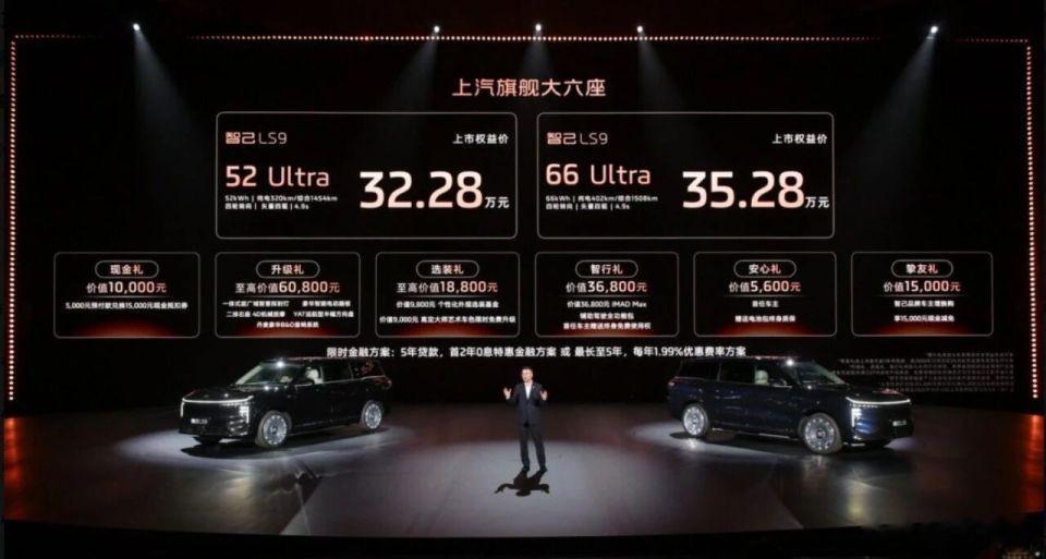 其中智己LS9 52 Ultra版的上市权益价32.28万元,66 Ultra版的上市权益价35.28万元。