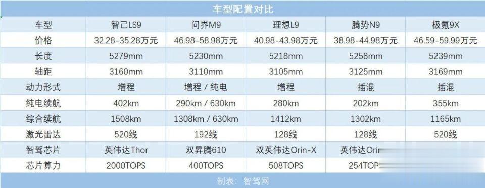 相比之下,理想L9 2025款的起售价为40.98万元,较智己LS9高出7万多元。腾势N9尊越型的定价为40.98万元,价格差同样是7万多元。极氪9X的入门价则为46.59万元,价格差达到了12.9万元。