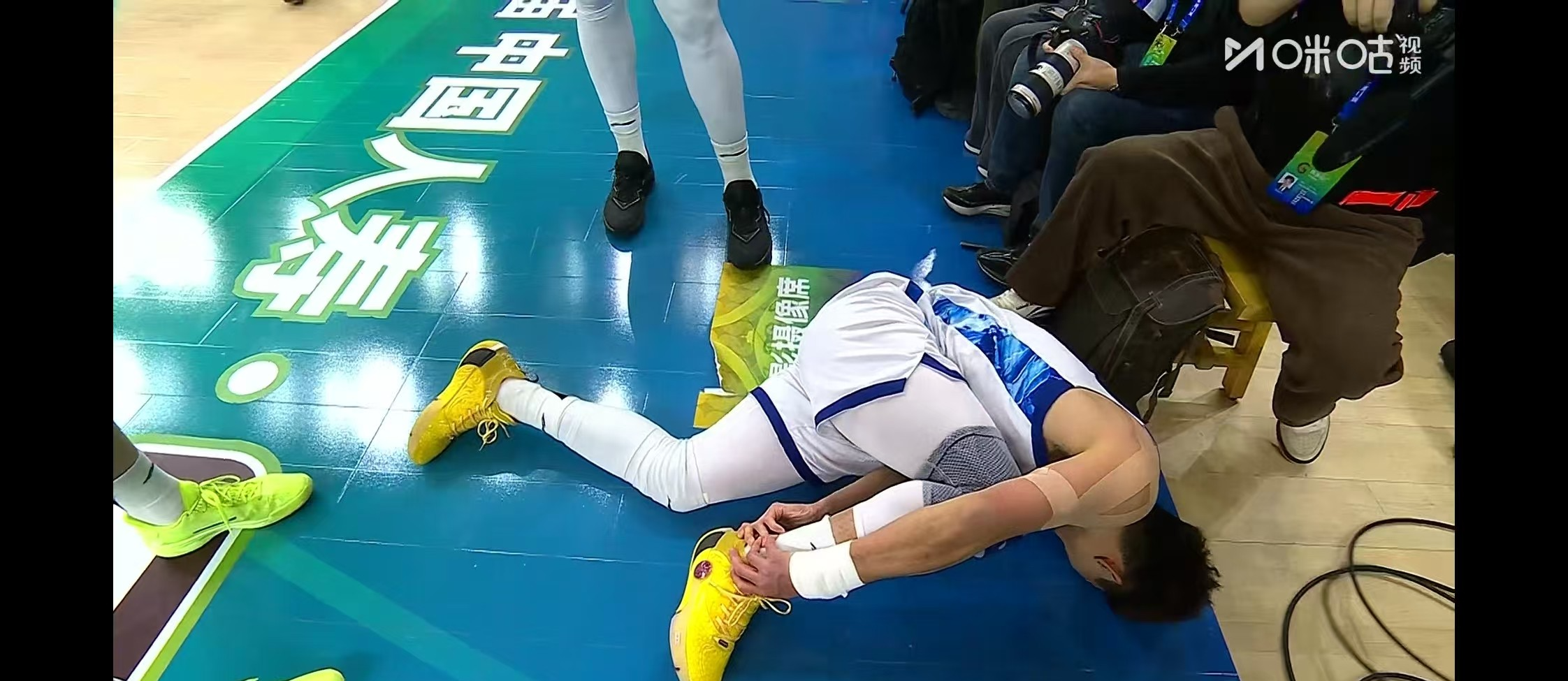 孙铭徽在地上躺了很长时间,随后广厦的工作人员把他背下场,虽然没有担架车进场,但孙铭徽自己明显不能走路了。