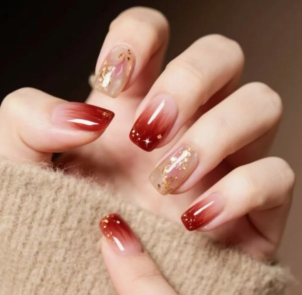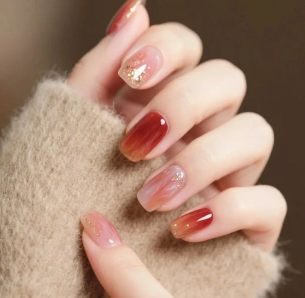 至于材质,今年可以试试哑光顶油。光面甲油虽然透亮,但看久了容易有塑料感。哑光质地把光泽收进去,颜色沉下来,手指显得修长干净。尤其适合短甲型,不会把注意力全集中在指甲盖的大小上。如果想保留一点新年氛围,只在无名指或中指做局部亮面,两种质地在同一色系里对话,比跳色更高级。