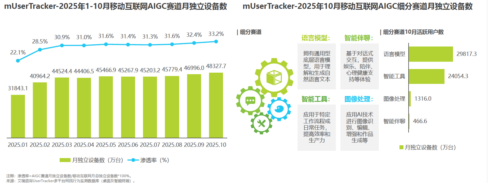 国内AI应用趋势也是如此。据调研机构艾瑞咨询发布的《中国移动互联网AIGC赛道流量报告》,2025年1月-10月,国内移动互联网AIGC应用独立设备数从3.18亿增长至4.83亿,渗透率从22.1%提升至33.2%,其中主流应用为大语言模型(2.98亿)和AI智能工具(2.41亿)。