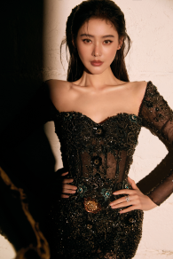 如果说绿色长裙是“写实”的工笔画,那么第二套黑色微透视长裙则是一首“写意”的光影诗。它放弃了全然的展现,转而运用透视薄纱与立体剪裁制造朦胧的层次。