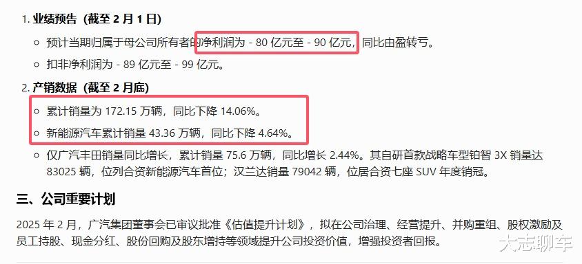 先说销量2025年,全年的广汽集团卖出去了172.15万辆,新能源销量达到了43.36万辆,而净利润方面,扣非净利润为-89亿元至-99亿元,也就是说,这个成绩就不说跟其他车企比较了,光跟2024年的广汽集团自己比都比不过来,因为2024年实现汽车产销量191.66万辆和200.31万辆,汽车出口12.7万辆,短短一年,就从盈利到亏损,广汽集团到底出了什么问题?