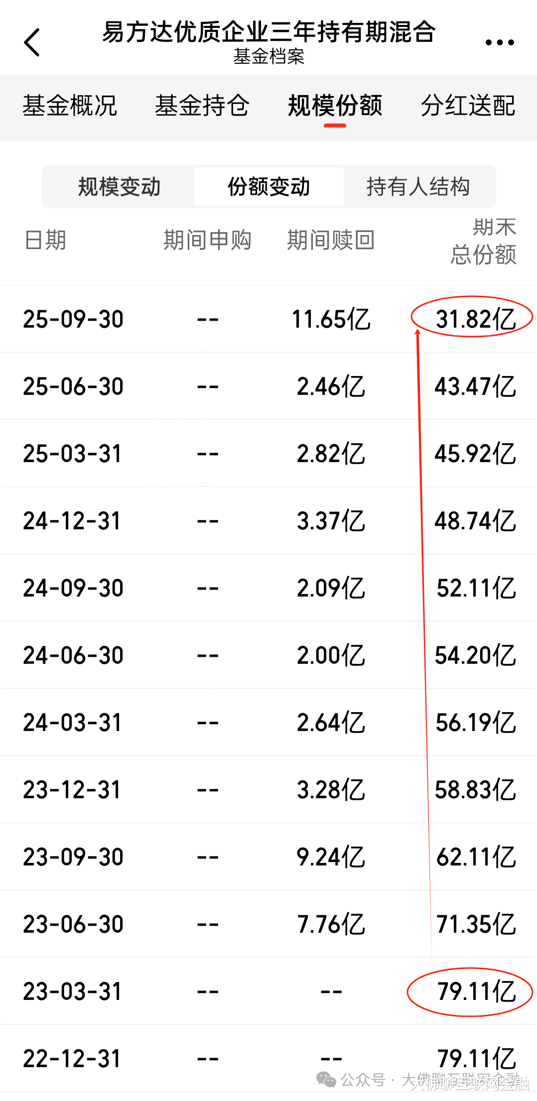 这只基后面一直没放开申购,从2023年6月开放赎回后,份额就从巅峰的79亿份减少到现在的31亿份。