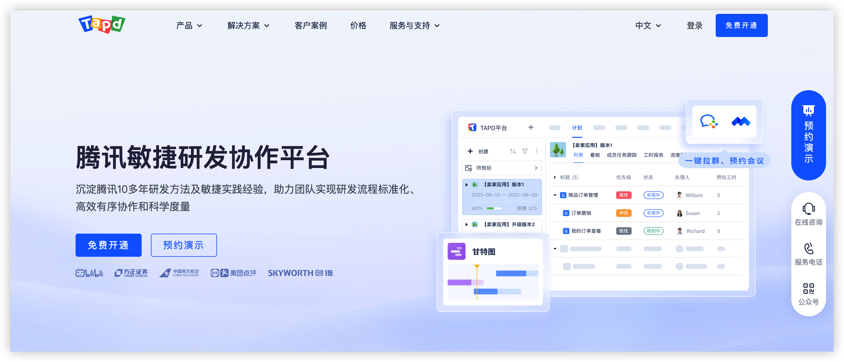 核心能力:TAPD LITE 的公开介绍直指 6 个核心应用:需求、迭代、故事墙、缺陷、报表、文档,并强调 Scrum/XP 的轻敏捷实践。