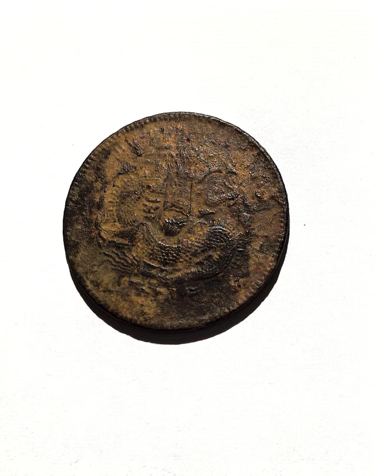 背面:龙纹是绝对的视觉核心。即便锈迹斑驳,仍能辨识出龙的威严形态 —— 龙鳞、龙爪的细节虽已模糊,却仍可感受到清代龙纹 “皇权象征” 与 “吉祥寓意” 的双重内涵。这种将传统图腾与现代铸币工艺结合的设计,是晚清文化碰撞的微观缩影。