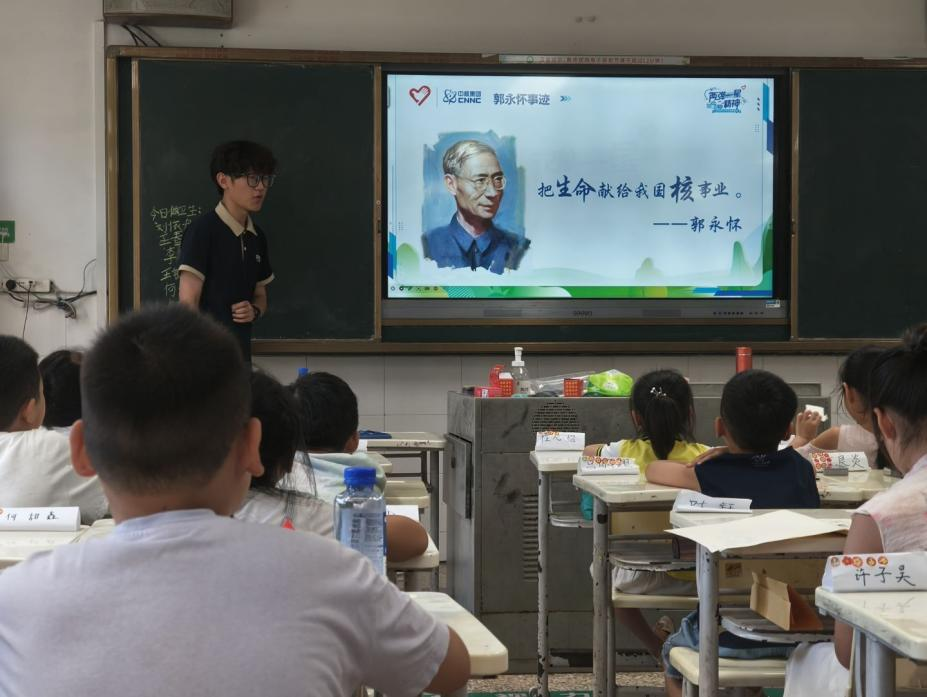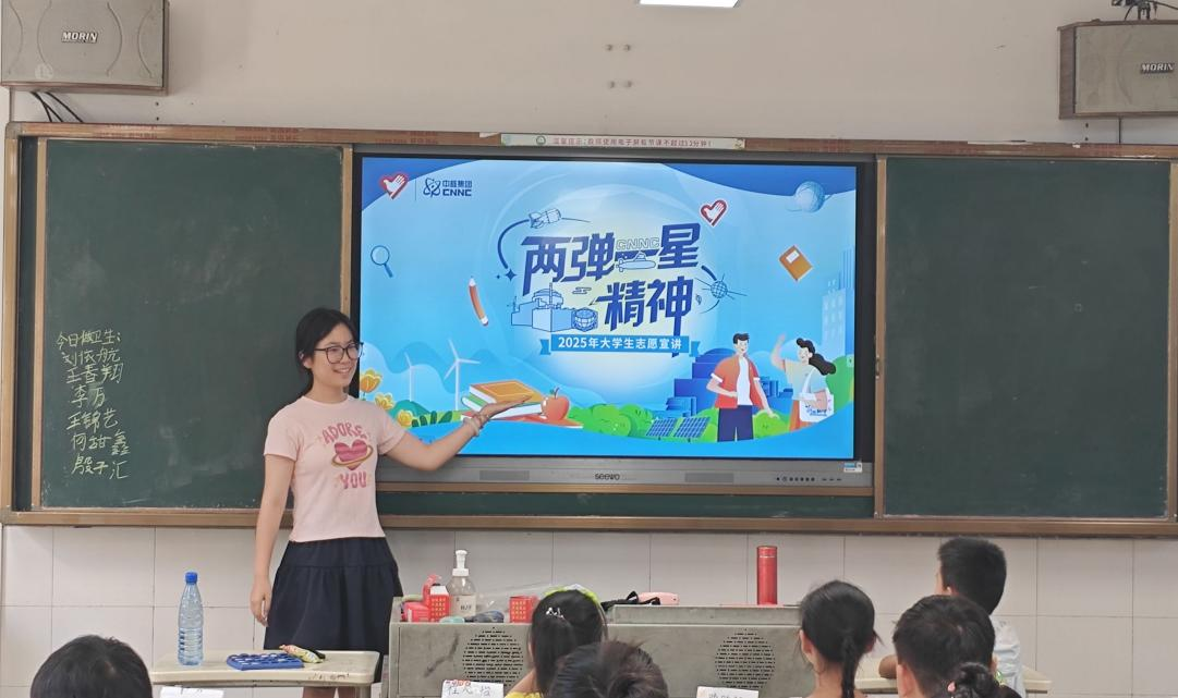 2025年7月末,华中科技大学“两弹一星”志愿宣讲团与该校予鹿支教队携手,为湖北省鄂州市泽林镇楼下小学的孩子们带来了“‘核’你在一起系列课程”,让两弹一星精神在孩子们心中生根发芽。