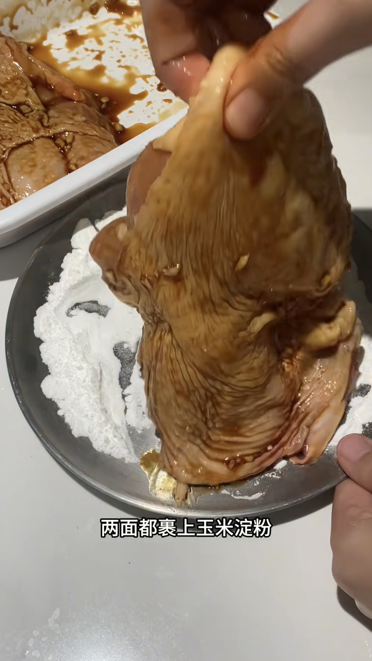 取出腌好的鸡肉,在玉米淀粉里滚三滚。这里有个反常识操作:别用手压淀粉!让每块鸡肉自然裹上薄薄一层,炸的时候才会形成蜂窝状脆皮。