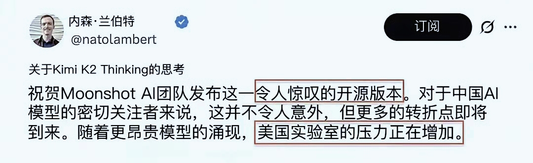 deepseek的面世打破了美国AI横扫全球的局面,让美国人头一次感到背后发凉,而Kimi K2 Thinking更让美国人绝望。
