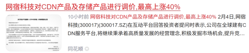 网宿科技的涨价将引发行业连锁反应,国内云厂商或将相继跟进。
