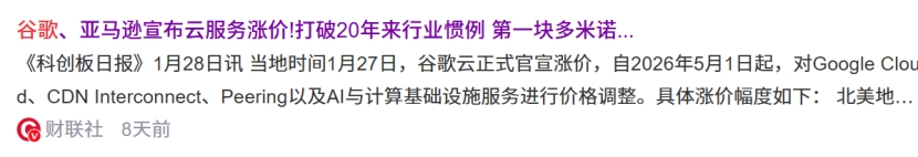 1月28日,根据谷歌云官网发布公告,公司将于2026年5月1日对GoogleCloud、CDN、Peering、AI基础设施等服务涨价;CDN方面,北美由0.04美元/GB上调至0.08;欧洲由0.05美元/GB上调至0.08;亚洲由0.06美元/GB上调至0.085。