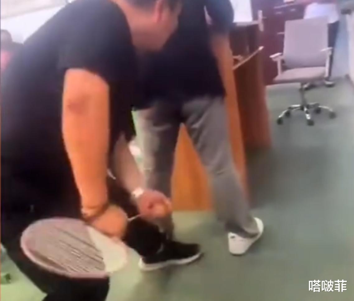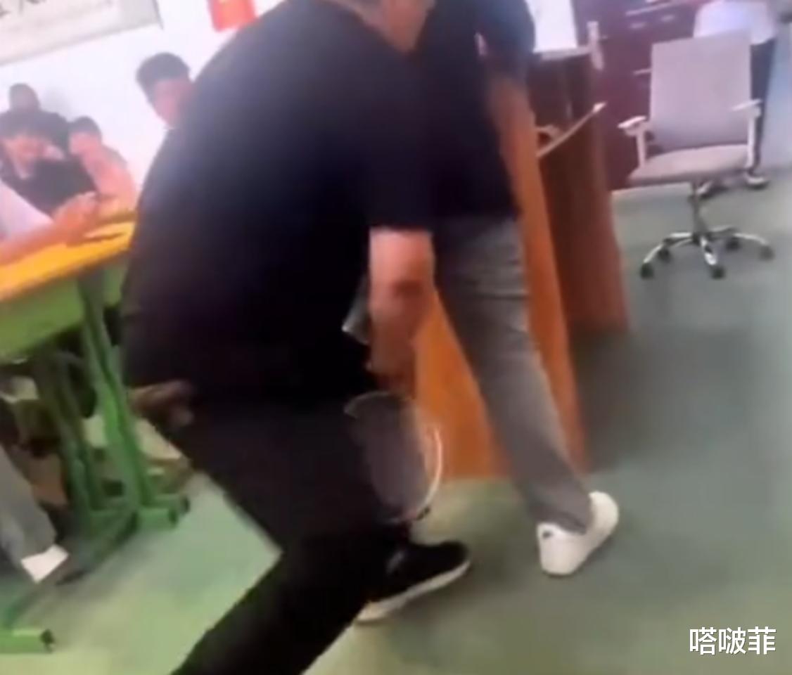 只见得该男老师拿着羽毛球拍的手柄,站在男学生的身后,蹲下身子之后,拿着球拍的把柄对着男学生的屁股捅了过去!这个行为着实不雅观,而且还是男老师对着男学生做出不符合身份的行为!
