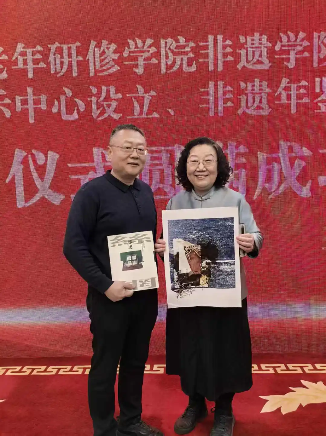 华夏希望基金健康医养工作委员会秘书长刘中 代表签约艺术家郑忠 向北京东方老年研修学院院长杨文霞捐赠作品。杨院长是非遗学院项目的发起人和负责人。