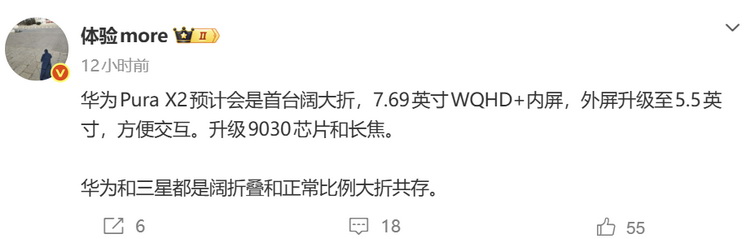 @体验more 在爆料中表示“华为Pura X2预计会是首台阔大折”,使用了7.69英寸WQHD+内屏,外屏升级至5.5英寸,方便交互,在未来华为折叠手机产品线中,阔折叠与正常比例大折叠会共存,但是他没有说明Pura X2屏幕比例。