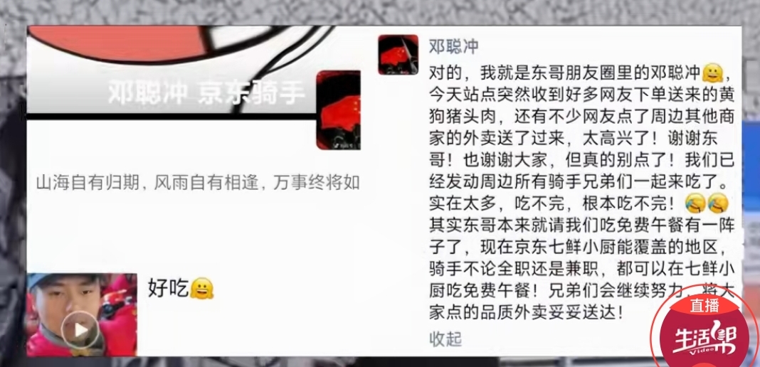 邓聪冲后来在朋友圈发文感谢:真的是太感谢东哥了,但这也太多了,黄狗猪头肉多到根本吃不完啊。