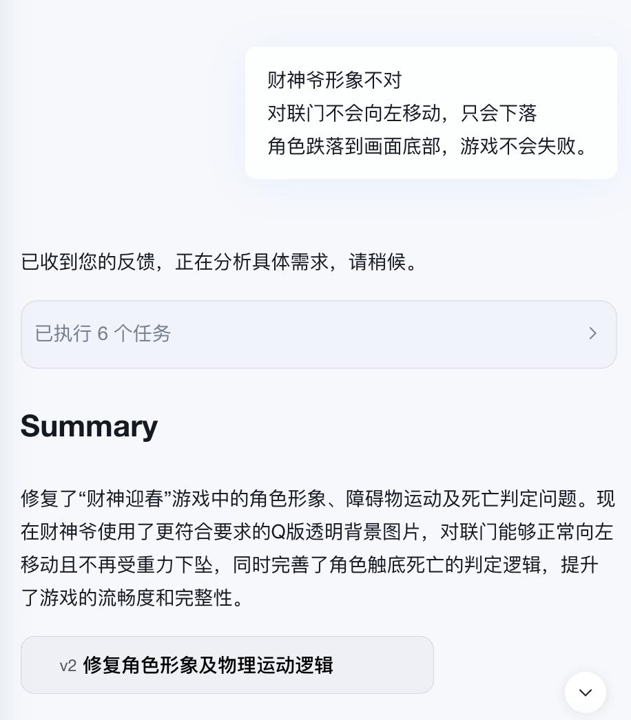 一开始我们的提示词很糙,大概就是“做一个像 Flappy Bird 一样的游戏,主角是财神”。