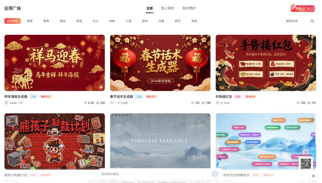 秒哒的应用广场上也有一批现成的春节工具,点开就能直接玩,编辑部也挑了几个趟了趟水。