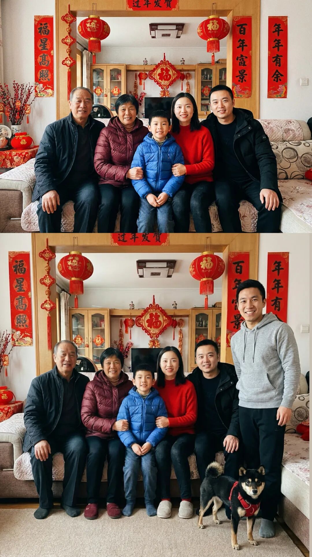 我们试了一张五人全家福,一张单人照,最后又塞一条狗进去(狗也算家庭成员)。