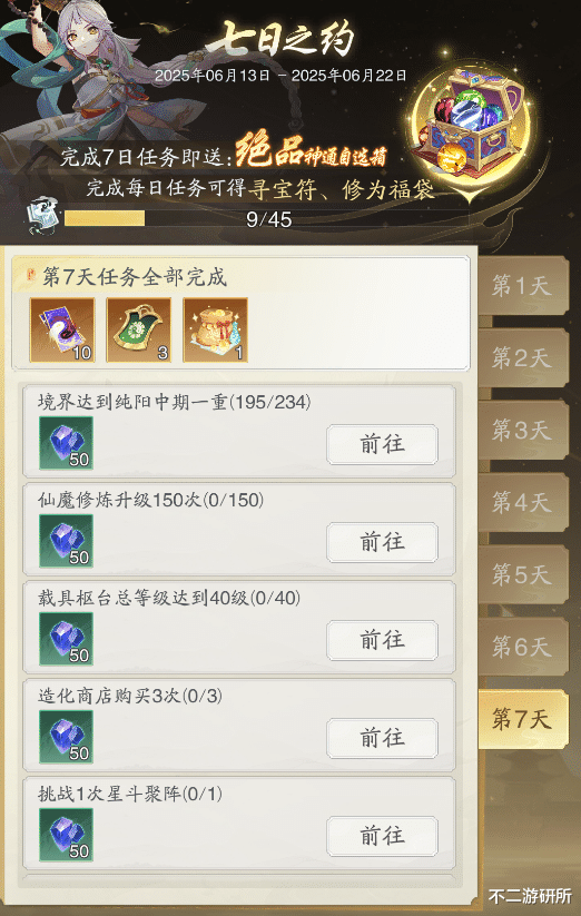 要说近期最大方的活动,还得是【七日之约】!6月13—22日每天随便做做小任务,灵界寻宝符、纯阳境修为福袋拿到手软,天机宝令轻松推演神通奥秘。坚持七天达标?系统直接奉上一个绝品神通自选箱!二十种灵界顶级神通任君挑选,待遇堪比宗门亲传弟子。零氪也能拿顶级核心技能?这波福利策划是真敢给!