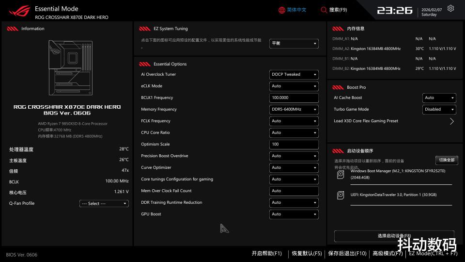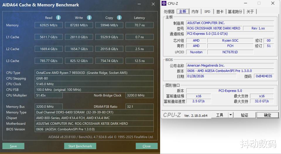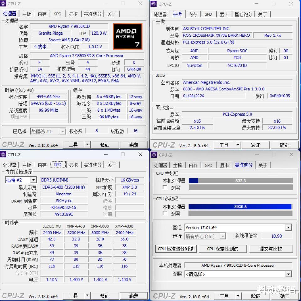 用了一年多的9800X3D被我换成了最近刚发布的9850X3D,毕竟在最大频率上0.4GHz的提升,对于单核性能表现还是有一定增强。作为一名尝鲜爱好者来讲,我也第一时间更新了我的硬件平台。这次也围绕9850X3D更新了配置,主板选择了华硕ROG CROSSHAIR X870E DARK HERO。ROG X870E DH主板堪称9850X3D处理器的黄金适配平台,待9950X3D V2推出之际,其亦将成为理想选择。