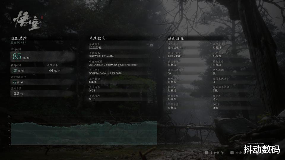 「黑神话悟空」游戏在1080P分辨率下,开启全景光线追踪超级后超级采样率为50的情况下,超分辨率采样为TSR 模式游戏平均帧数85 FPS,最低帧数44FPS。