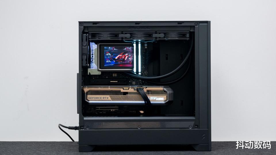 机箱内部空间一览,机箱顶部支持安装最大360mm尺寸一体式水冷,支持最高170mm风冷。支持标准ATX主板安装,最大支持长度为416mm的显卡安装。
