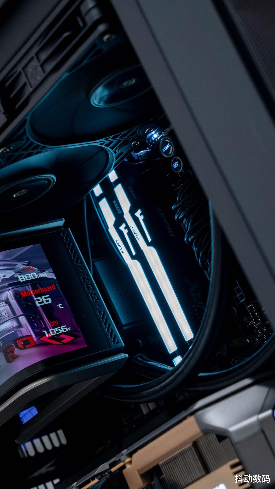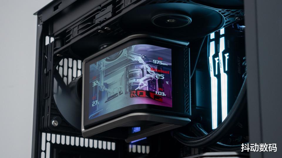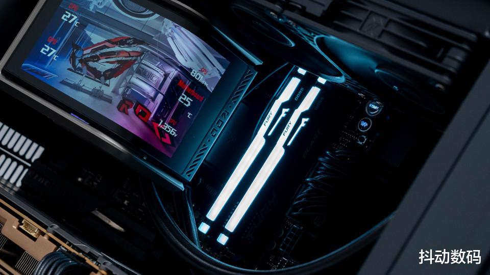 ROG 龙王4代散热器的冷排头部设计支持横向位移调节功能,该创新结构可有效提升产品多维度展示效果。经实际测试验证,该设计在搭配带RGB灯效的内存时,仍能确保其兼容性,不会对正常使用造成任何影响。