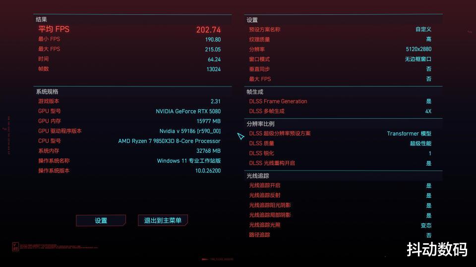 「2077」游戏5K 分辨率下开启光追的情况下,开启DLSS 4游戏平均帧数202.74 FPS,最低帧数190.80 FPS。
