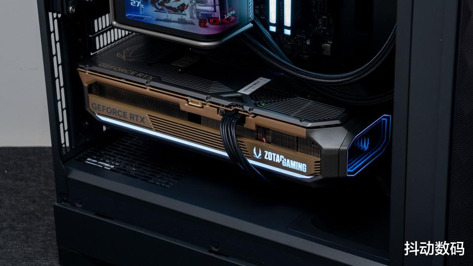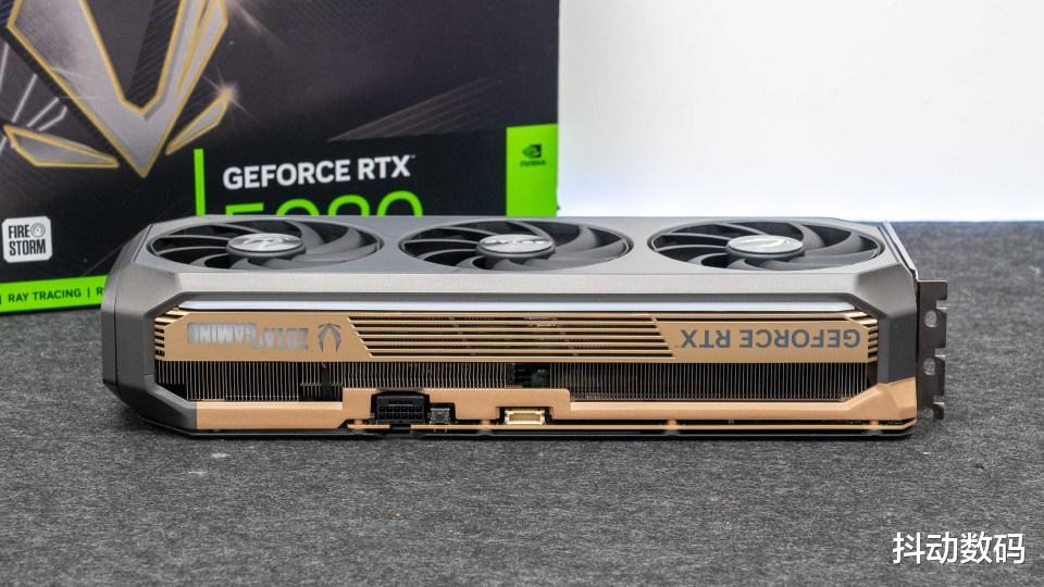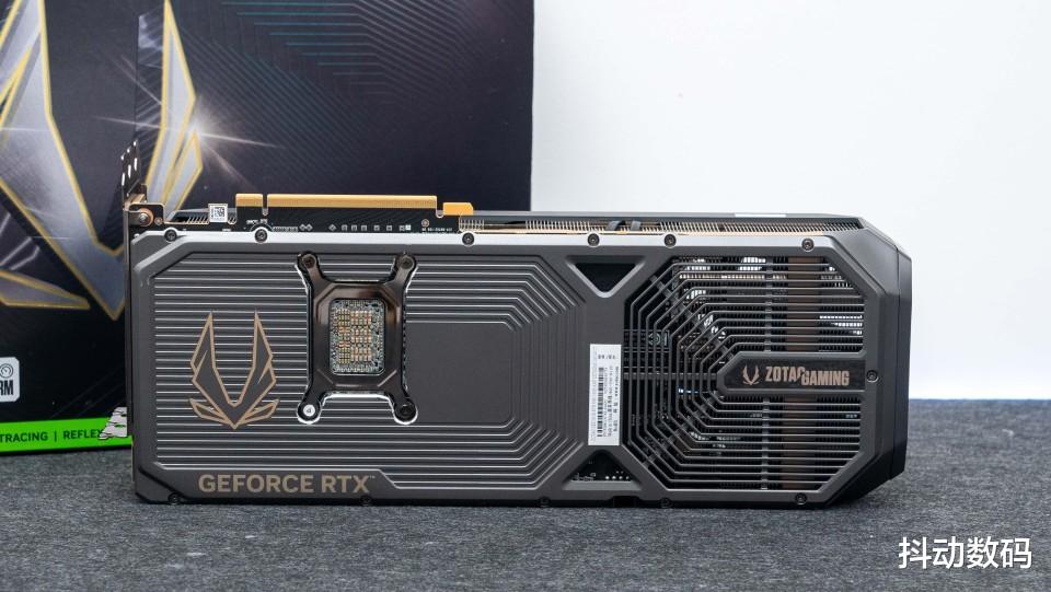这款RTX 5080 AMP可能是索泰显卡中灯光最多的一款了,除了侧面的贯穿式灯带之外,显卡侧面的ZOTAC GAMING也做了灯光设计。
