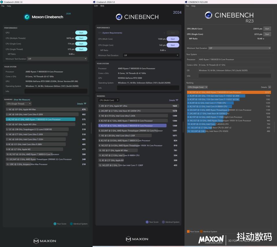 Cinebench 测试:2026 测试CPU多核分为5278 pts,单核 774pts,单线程575 pts;2024 测试CPU多核分为1369 pts,单核 143 ptsR23测试CPU多核分为23015 pts,单核 2212 pts对比测试可以看到对比9800X3D处理器的话,多核成绩提升不明显,但是单核分数有明显提升。