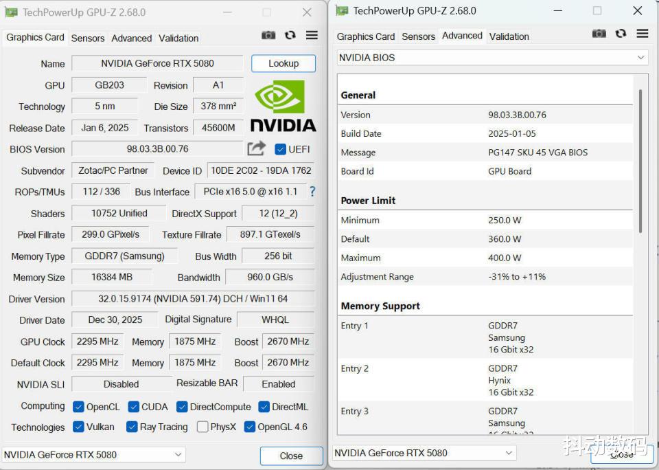 与索泰的RTX 50 SOLIID显卡一样,整体采用深灰色的设计,搭配金色的点缀。这张RTX 5080 AMP显卡的基础频率是2295MHz,最高主频2670MHz,搭配了16G GDDR7显存,显存位宽256bit,TDP功耗为360W,最高可达400W。