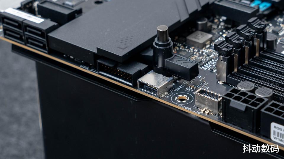 主板一侧提供了两个前置20Gbps Type-C接口插头,可以更好地满足ROG 太阳神焕新版机箱的前置扩展需求。另外前置USB 3.0接口也升级到了两个,其中一个前置USB3.0终于放倒了,这样插拔更方便了。
