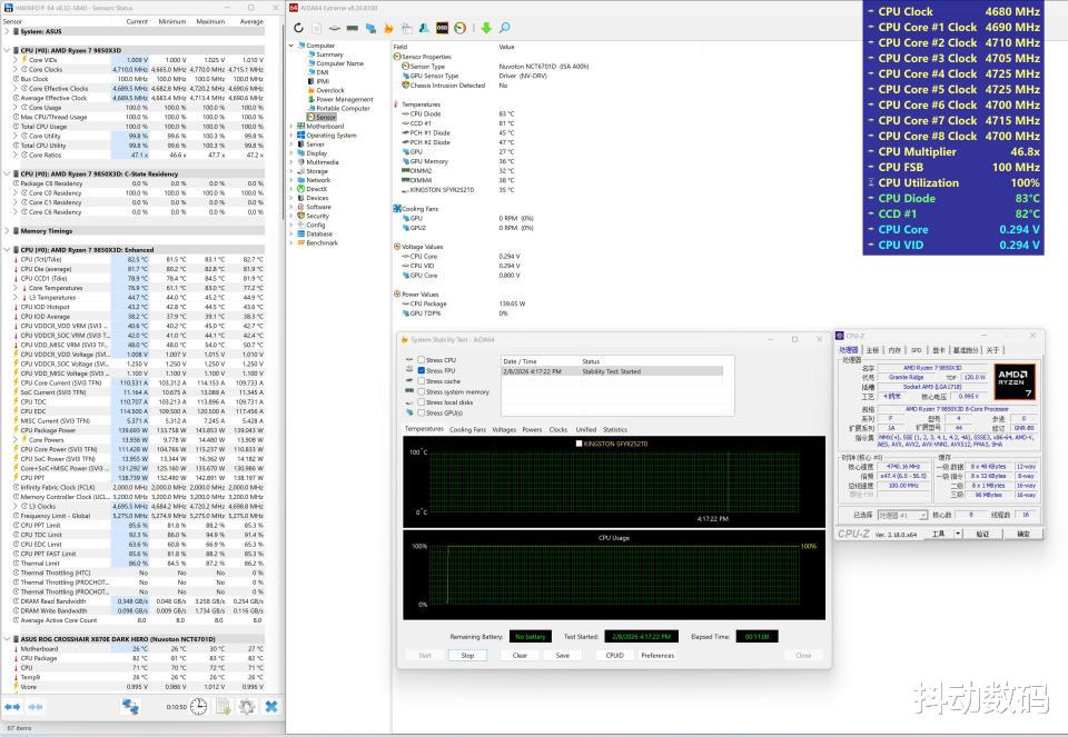 9850X3D处理器的AIDA 64 FPU 单烤测试如图,CPU 频率 4.7GHz,TDP 140W,CPU温度最高82.5 ℃。通过测试可以看到9850X3D的温度表现确实控制得比较好,或者说替换了ProArt PF120风扇的ROG 龙王 4一体式水冷散热的表现确实不错。
