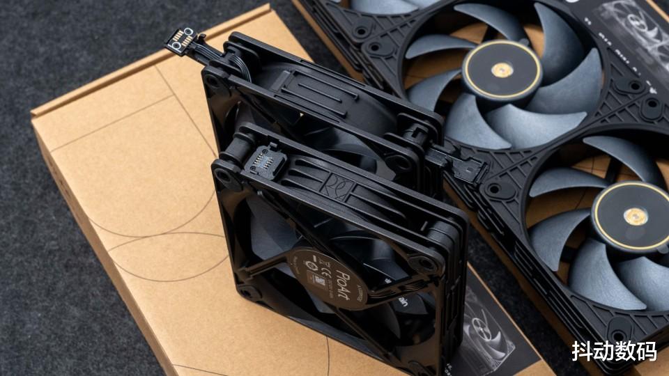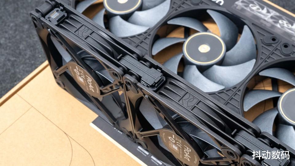 另外这次的风扇换成了无光版本的华硕 ProArt PF120 风扇来更好地降低9850X3D的温度,华硕的ProArt PF120 风扇在满速 3000RPM下降温表现真的足够强。 而且安装上,每把风扇都自带连接杆,可以更好地实现串联。