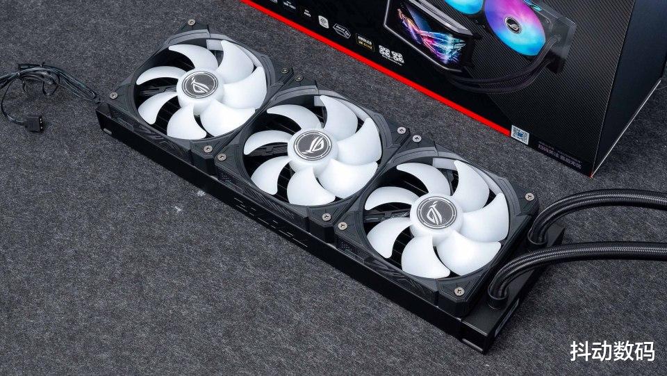 冷排侧面也有ROG的logo设计,冷排厚度为28mm。另外新设计的菊花链风扇为出厂预装设计,风扇侧面也有个性化光效设计。